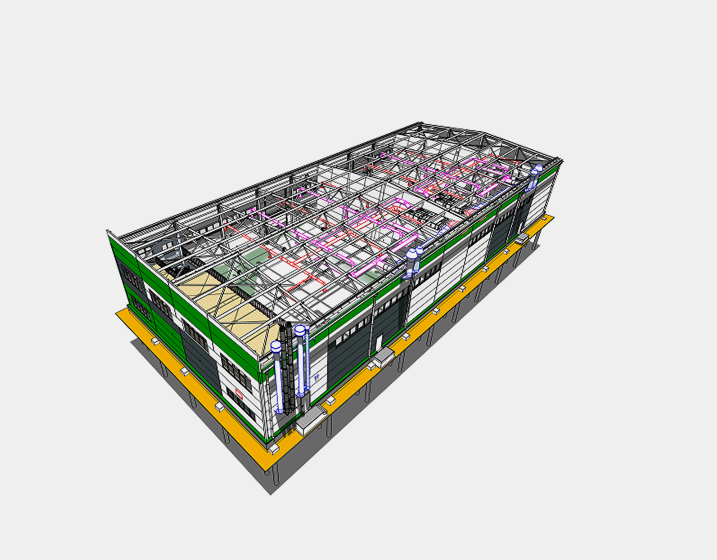 Решение: провели изыскания, заложили свайный фундамент с ростверком и стальной каркас. Проработали планировку под конкретную технологию: габариты, нагрузки, стыковку складского оборудования. Получили положительное заключение в экспертизе с первого раза благодаря BIM-координации.